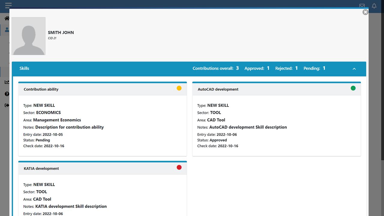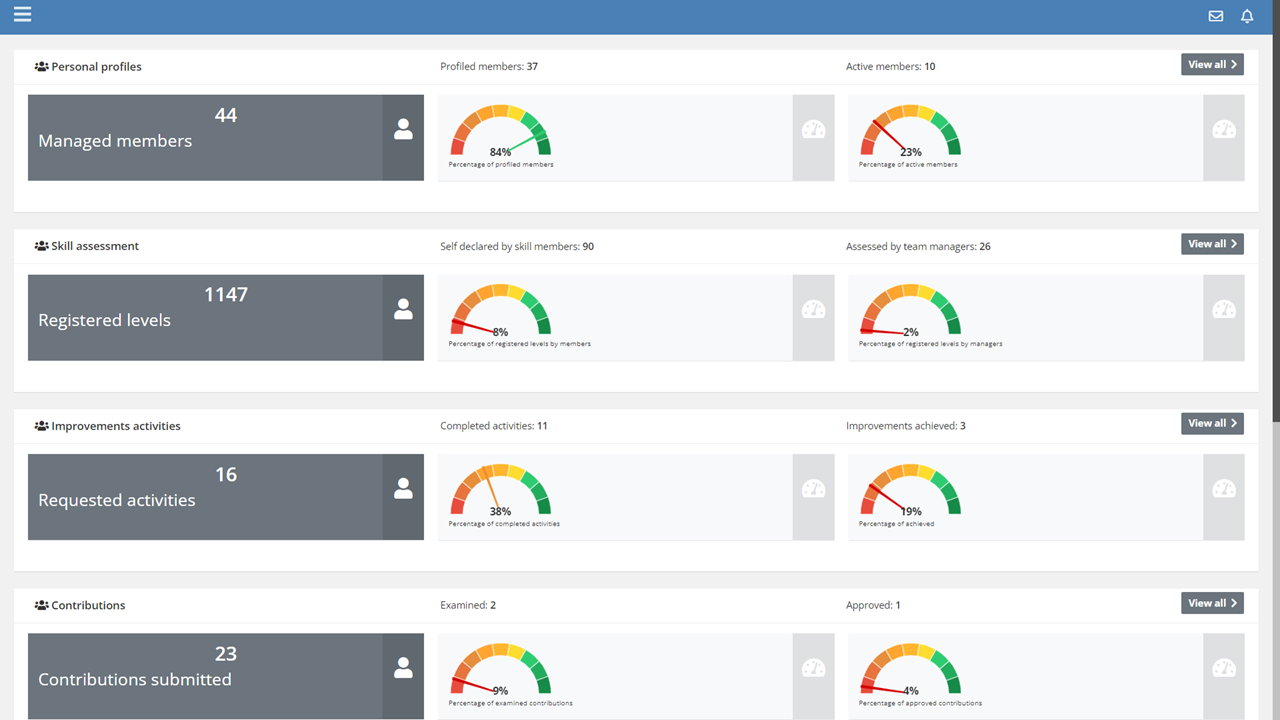 Like the Team Manager, the General Manager does not manage the catalogs of skills and job positions, but can view all the contributions presented by Team Members to improve the organization's knowledge base.