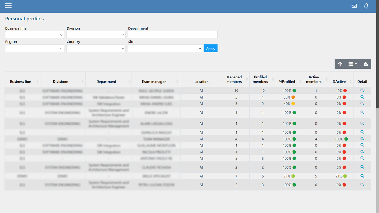 In addition to the data of each individual person, the manager can view the aggregate data of the teams and, using the appropriate filters, those of the departments and divisions of the part of the organization that he is authorized to manage.