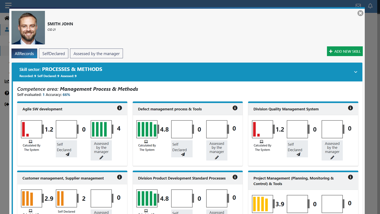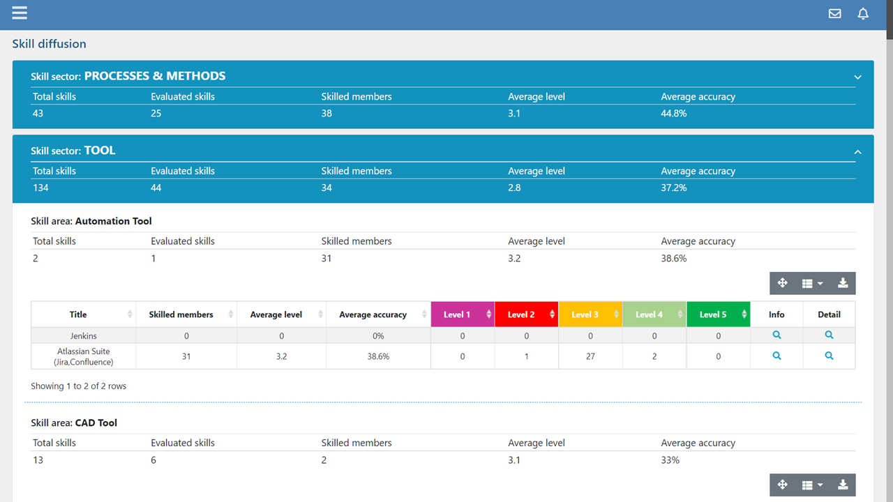 Based on a convenient drill-down system, Skill Diffusion allows you to view aggregate information and then unpack it up to the list of people evaluated on a specific skill.