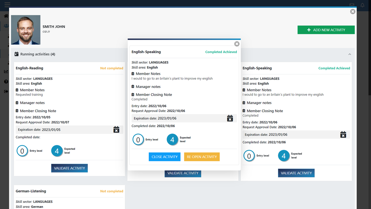 The manager can assign improvement objectives on the skills he deems critical. He can receive and evaluate the activities proposed by his collaborators. The manager can also monitor the status of tasks and request their completion, or close them if he believes they will not be completed.