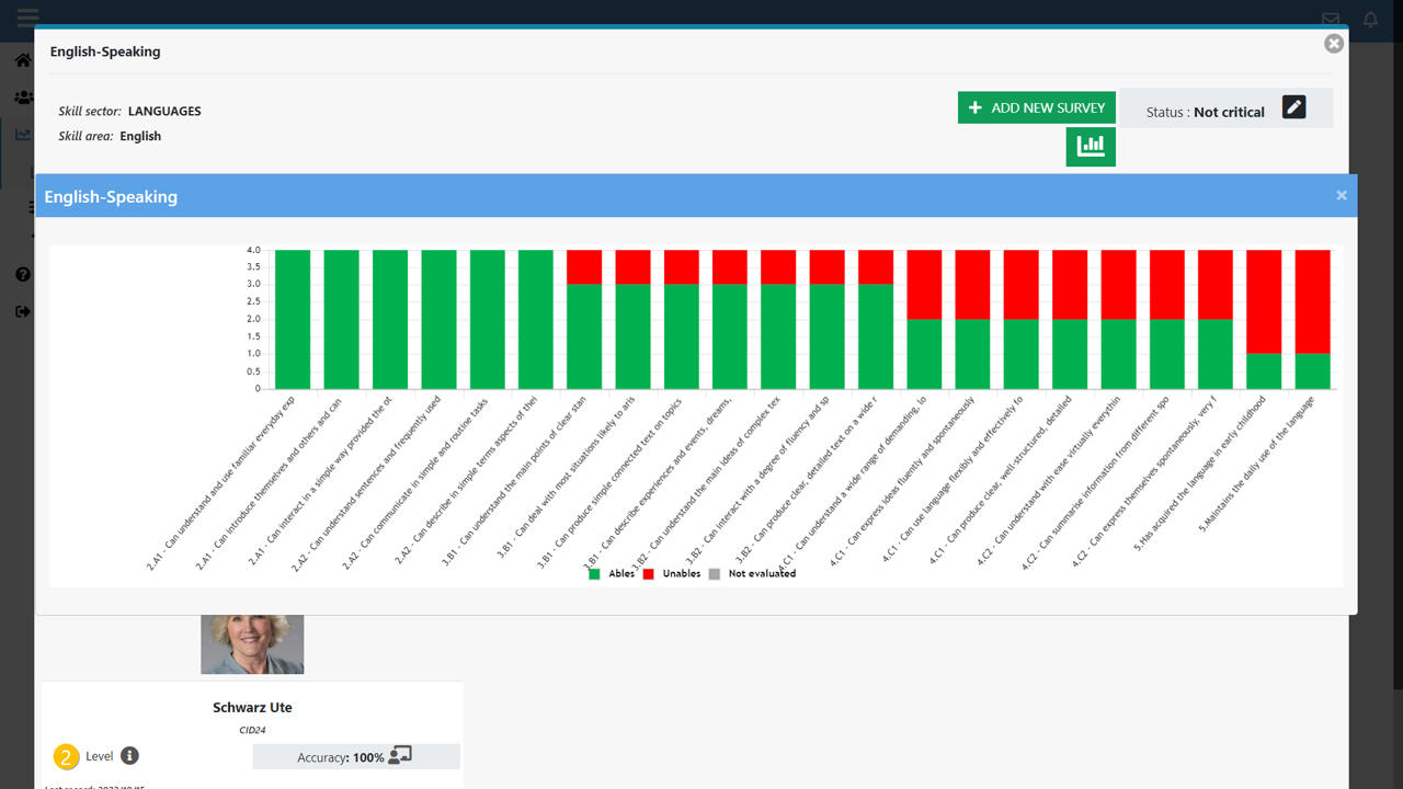 The manager has the possibility to modify the levels declared by the collaborator or to accept them as they are. When the audit is complete, the proficiency levels are recorded as approved by the manager and are interpreted by the Skill Center with an accuracy of 100%.